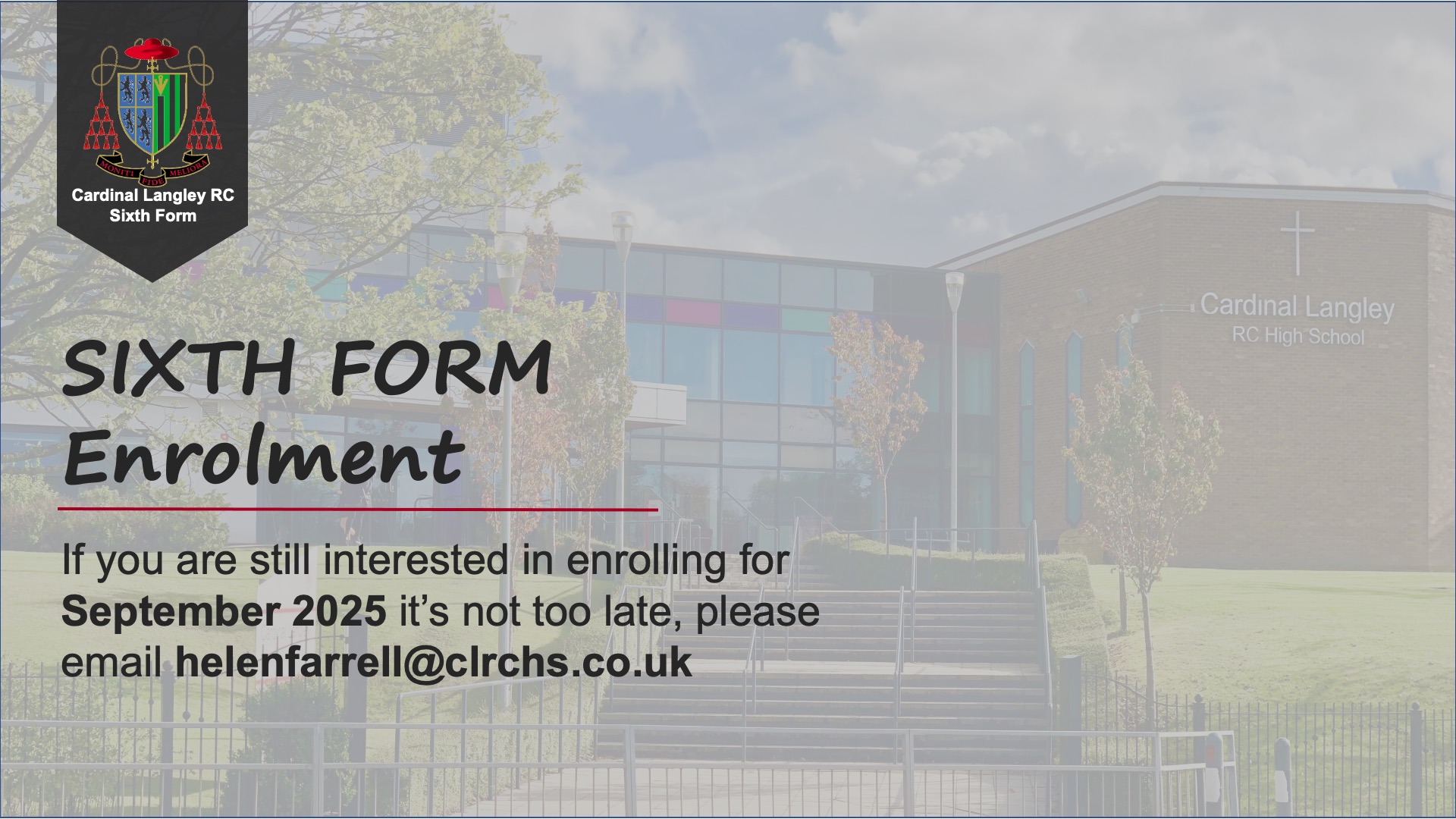 Cardinal Langley Sixth Form is a successful place of study; we will work with you to help you realise your ambitions and reach your potential. When joining the Sixth Form, you will become part of our Catholic community and you will be supported by well qualified and experienced teachers in your academic study as well as being supported by Senior Tutors and Student Ambassadors in your pastoral needs.